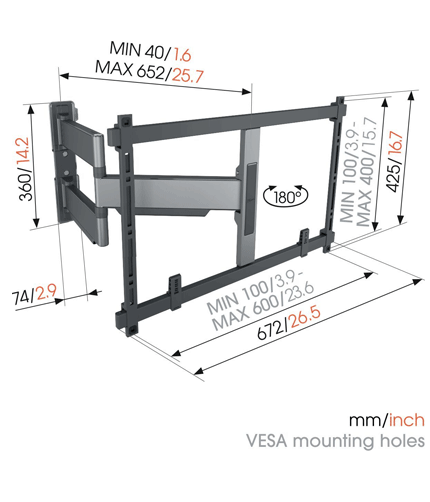 Full-motion, ultra-slim TV wall mount for high-end TVs from 40 to 77 inches The ELITE Full-Motion+ TV wall mount combines minimalistic design with great performance. The wall mount is not only ultra-slim, but also ultra-strong and can be turned up to 180°. In short, the ultimate wall mount for large high-end TVs, such as OLED and QLED TVs. The TV wall mount is suitable for displays from 40 to 77 inches in size and weighing up to 45 kg. In the starting position, your TV is mounted just 4 cm from the wall. Available in the colours White and Platinum Grey.